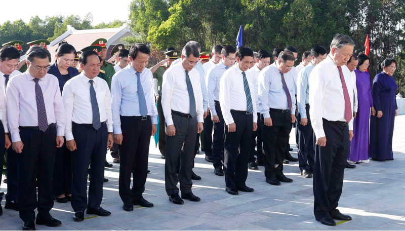 Tổng Bí thư Tô Lâm và Đoàn công tác Trung ương dâng hoa, dâng hương tại Nghĩa trang Liệt sĩ Trà Võ. (Ảnh: Thống Nhất/TTXVN)