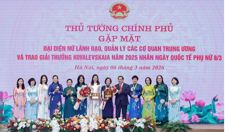 Sáng 6/3, tại trụ sở Chính phủ, Thủ tướng Phạm Minh Chính gặp mặt nữ lãnh đạo, quản lý các cơ quan Trung ương và trao giải thưởng Kovalevskaia năm 2025. Thủ tướng mong muốn phụ nữ Việt Nam tiếp tục nỗ lực xây dựng và kiến tạo giá trị và bản sắc người phụ nữ Việt Nam thời đại mới theo phương châm: Giữ lửa truyền thống - Dẫn dắt sáng tạo - Làm chủ tri thức - Vượt qua chính mình - Tự tin hội nhập - Lan tỏa nhân ái - Kiến tạo tương lai.