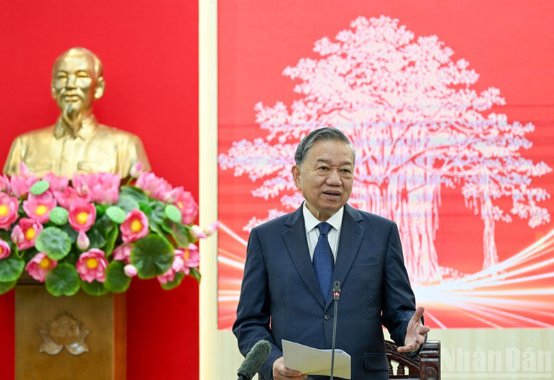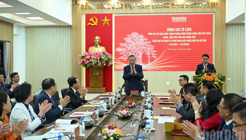Bày tỏ niềm vui đến thăm, làm việc với tập thể cán bộ chủ chốt của Báo, Tổng Bí thư Tô Lâm khẳng định, 75 năm là một chặng đường rất đáng tự hào. Đây không chỉ là dịp để chúc mừng, ghi nhận, tri ân những đóng góp rất quan trọng của các thế hệ người làm Báo Nhân Dân, mà quan trọng hơn, là dịp để cùng nhau nhìn thẳng vào yêu cầu mới, nhiệm vụ mới, áp lực mới, thời cơ mới, nhất là làm rõ, Báo phải làm gì, đổi mới thế nào, đi đầu ở những lĩnh vực nào.