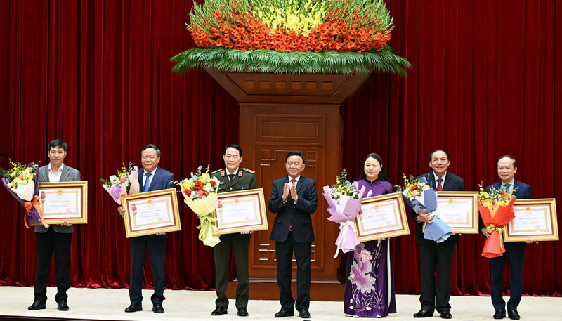 Hội nghị công bố các quyết định khen thưởng các tập thể, cá nhân có thành tích xuất sắc trong tham mưu, tổ chức phục vụ Đại hội XIV của Đảng. Thay mặt Bộ Chính trị, Ban Bí thư, đồng chí Trần Cẩm Tú và các đồng chí lãnh đạo Đảng, Nhà nước trao Huân chương Lao động hạng Nhất, Nhì, Ba tặng 14 cơ quan, đơn vị.